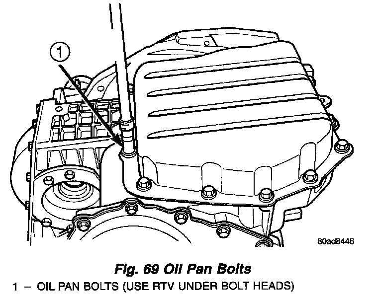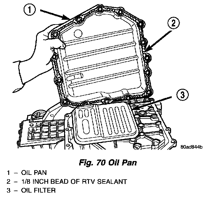 7. Install a 1/8" bead of RTV as shown in (Fig. 70) and install pan to case.