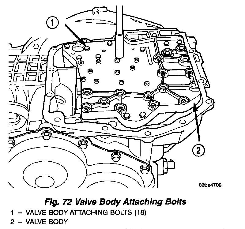 5. Install the valve body-to-case bolts (Fig. 72) and torque to 12 Nm (105 inch lbs.).