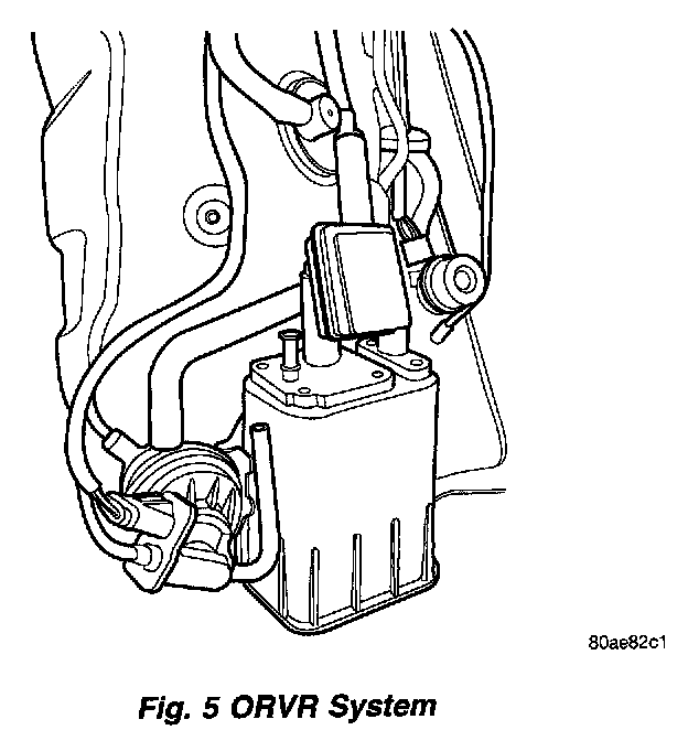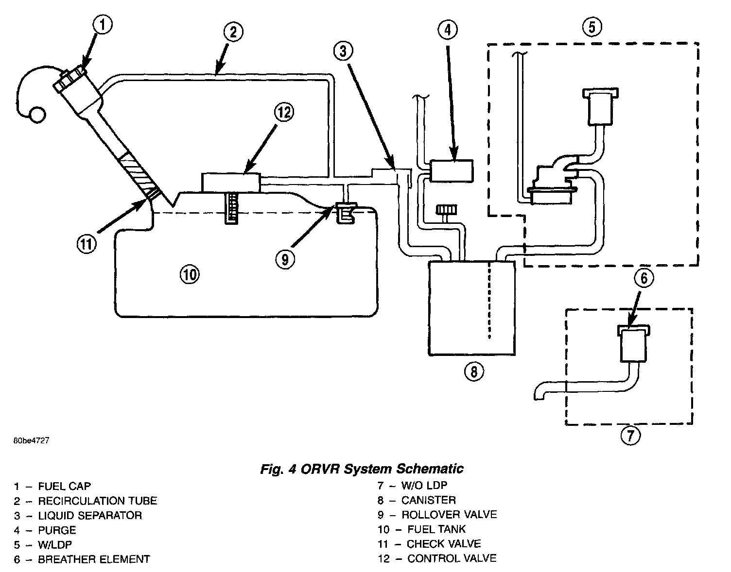 The emission control principle used in the ORVR system is that the fuel flowing into the filler tube (appx. 1" I. D.) creates an aspiration effect which draws air into the fill tube (Fig. 4). During refueling, the fuel tank is vented to the vapor canister to capture escaping vapors. With air flowing into the filler tube, there are no fuel vapors escaping to the atmosphere. Once the refueling vapors are captured by the canister, the vehicle's computer controlled purge system draws vapor out of the canister for the engine to burn. The vapors flow is metered by the purge solenoid so that there is no or minimal impact on driveability or tailpipe emissions.