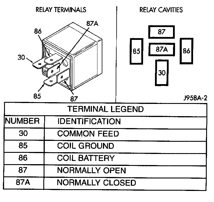 2. The relay normally closed terminal (87A) is connected to terminal 30 in the de-energized position, but is not used for this application. Go to Step 3.
