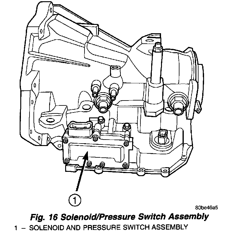 The Solenoid/Pressure Switch Assembly (Fig. 16) is external to the transaxle and mounted to the transaxle case. The assembly consists of four solenoids that control hydraulic pressure to the LR/CC, 2/4, OD, and UD friction elements. The reverse clutch is controlled by line pressure from the manual valve in the valve body. The solenoids are contained within the Solenoid/Pressure Switch Assembly, and can only be serviced by replacing the assembly.