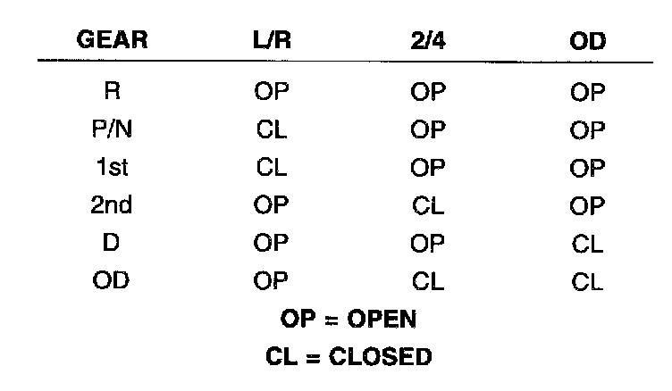 The TCM relies on three pressure switches to monitor fluid pressure in the L/R, 2/4, and OD hydraulic circuits. The primary purpose of these switches is to help the TCM detect when clutch circuit hydraulic failures occur. The range for the pressure switch closing and opening points is 11 - 23 psi. Typically the switch opening point will be approximately one psi lower than the closing point. For example, a switch may close at 18 psi and open at 17 psi. The switches are continuously monitored by the TCM for the correct states (open or closed) in each gear as shown in the chart: