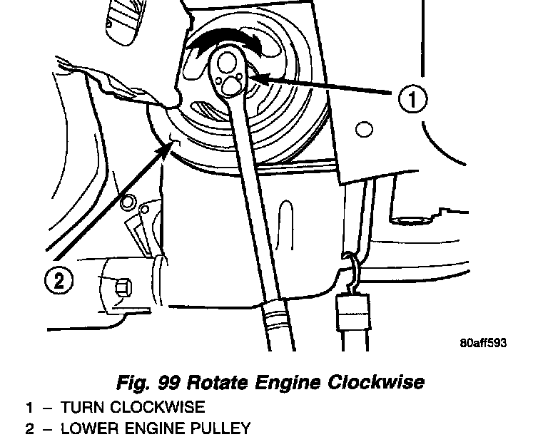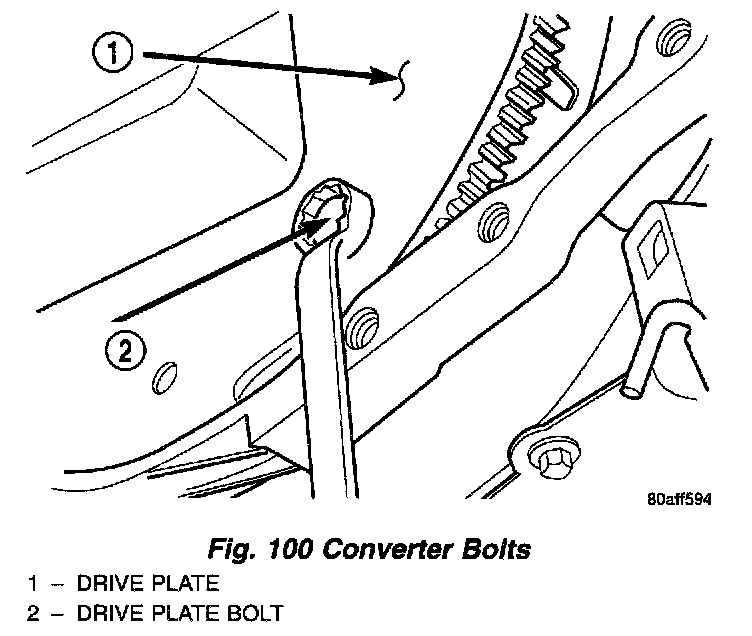 23. Rotate engine clockwise to line up converter bolts (Fig. 99). Remove converter bolts (Fig. 100). Mark converter for reassembly ease.