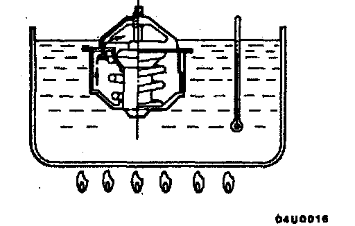^ Immerse thermostat in a container of hot water. Stir to raise water temperature and check that the thermostat, valve opening temperature and the water temperature with valve fully open 9 mm (0.35 inches) are at the standard value.