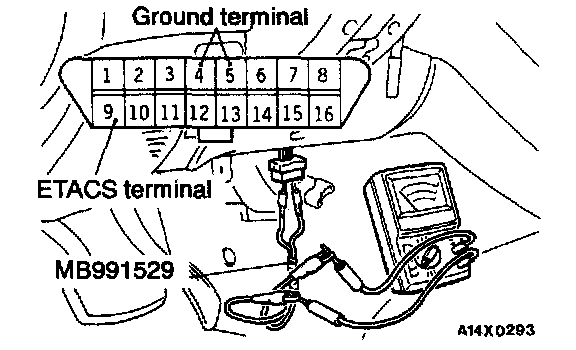 1. Use the special tool to connect a voltmeter between the ground terminal and the ETACS terminal of data link connector.
