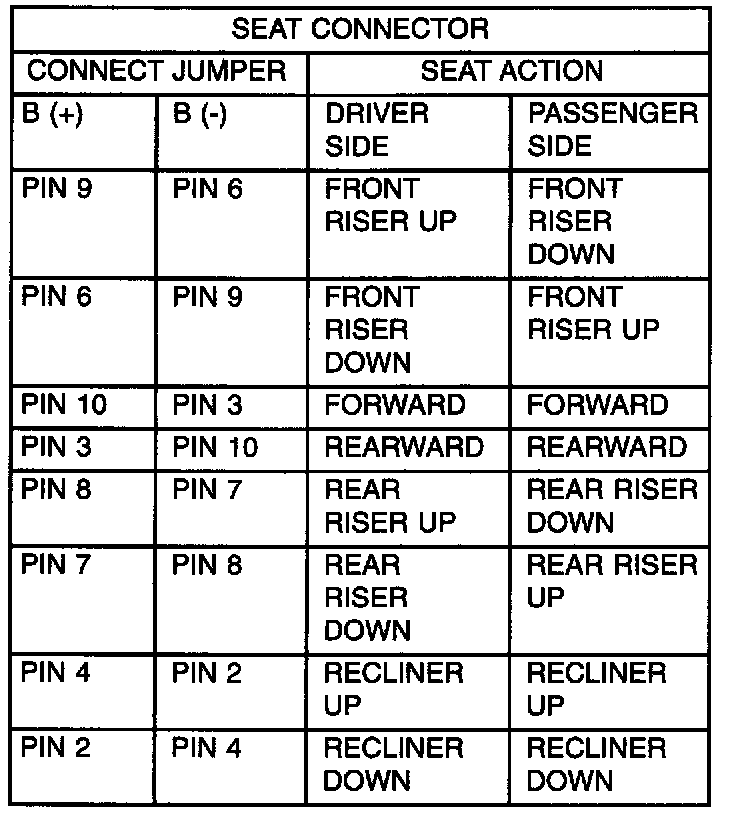 4. To test the seat motors and verify proper seat responses, refer to the Seat Motor Test table. Using two jumper wires, connect one to a battery supply and the second to a ground. Connect the other ends to the seat wire harness connector as described in the Seat Motor Test table.