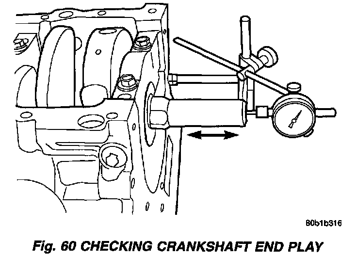 STANDARD PROCEDURES - CRANKSHAFT END PLAY1. Using Dial Indicator C-3339 and Mounting Post L-4438, attach to front of engine, locating probe perpendicular on nose of crankshaft (Fig. 60).