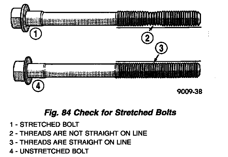 2. Check connecting rod bolts for necking by holding a scale or straight edge against the threads. If all threads do not contact the scale, the bolt must be replaced (Fig. 84).