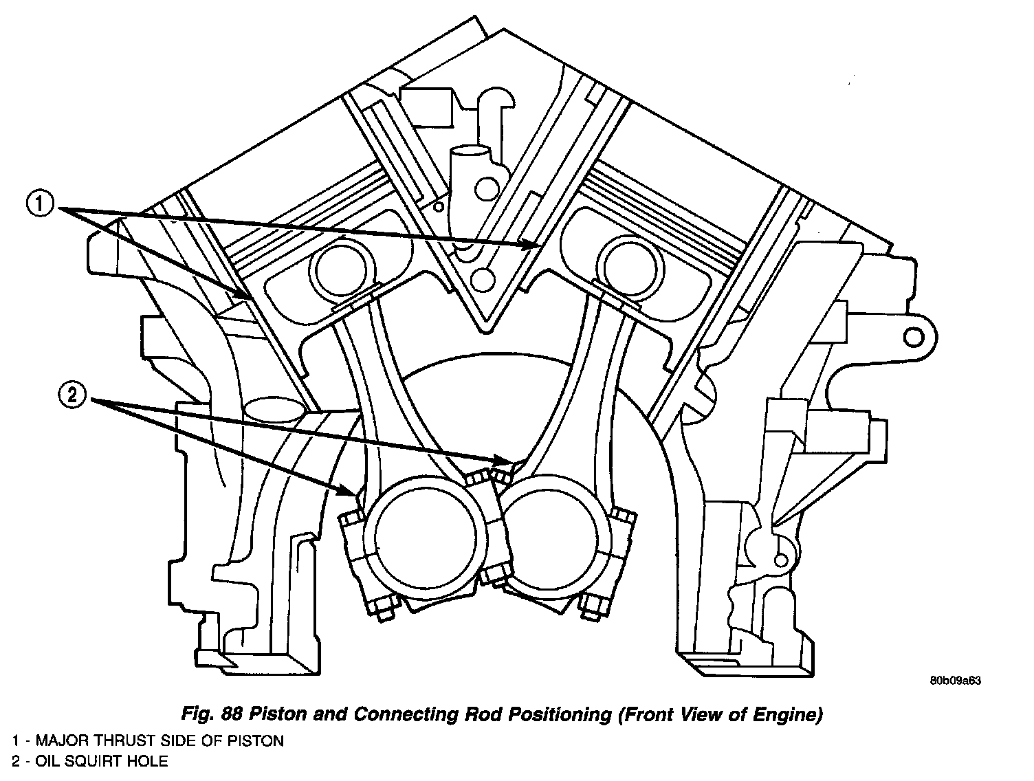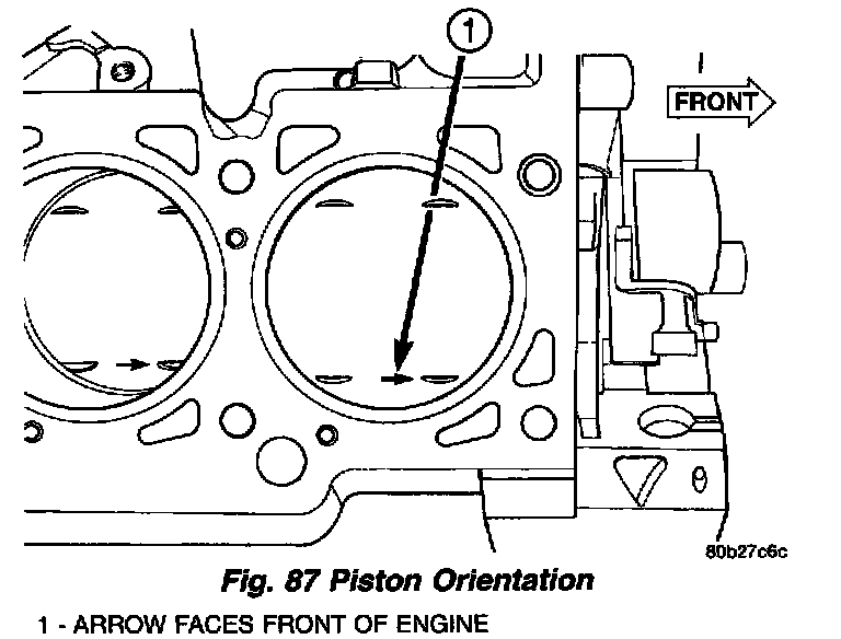 7. The arrow on top of piston must be pointing toward front of engine (Fig. 87) and oil squirt hole on connecting rod faces the major thrust (right) side of the cylinder bore (Fig. 88).