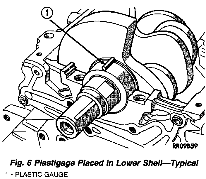 2. Place a piece of Plastigage across the entire width of the bearing shell in the cap approximately 6.35 mm (1/4 inch) off center and away from the oil holes (Fig. 6). (In addition, suspected areas can be checked by placing the Plastigage in the suspected area). Torque the bearing cap bolts of the bearing being checked to the proper specifications.
