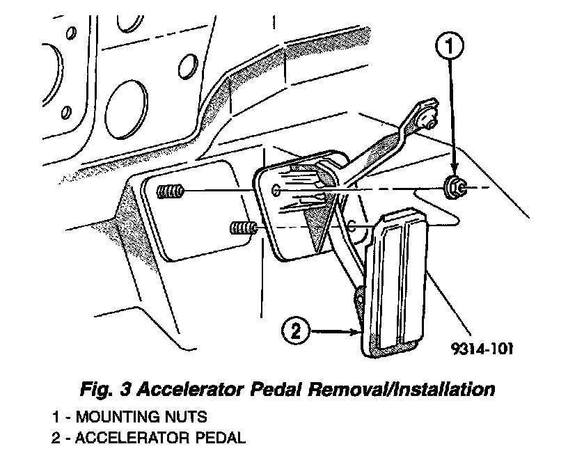 3. Working from the passenger compartment, remove nuts from accelerator pedal base (Fig. 3) Remove pedal and base from vehicle.
