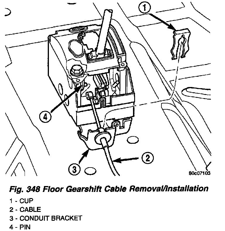 (4) Disconnect shifter cable from shift pin (Fig. 348) and disconnect cable from shifter assembly bracket.