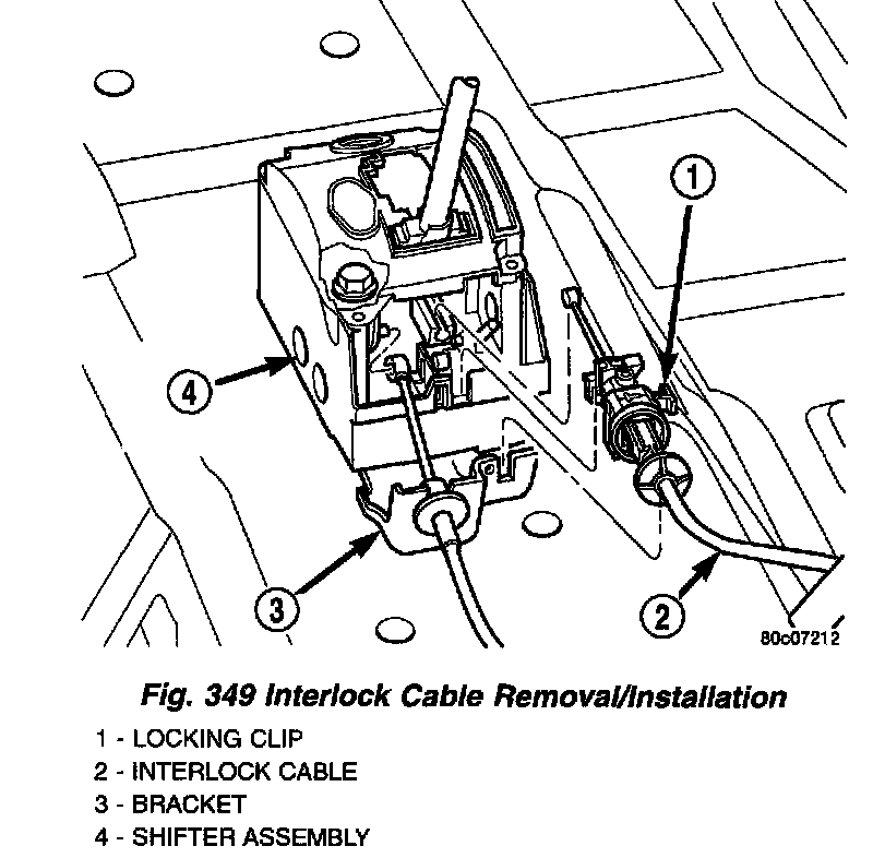 (5) Disconnect interlock cable from shifter base slot (Fig. 349). Be careful not to break tab on interlock cable conduit end fitting.