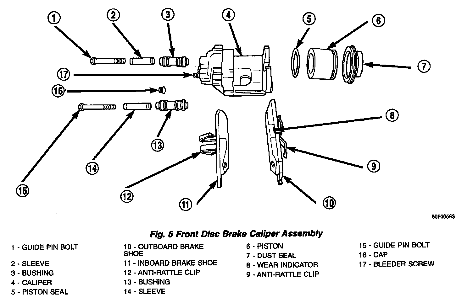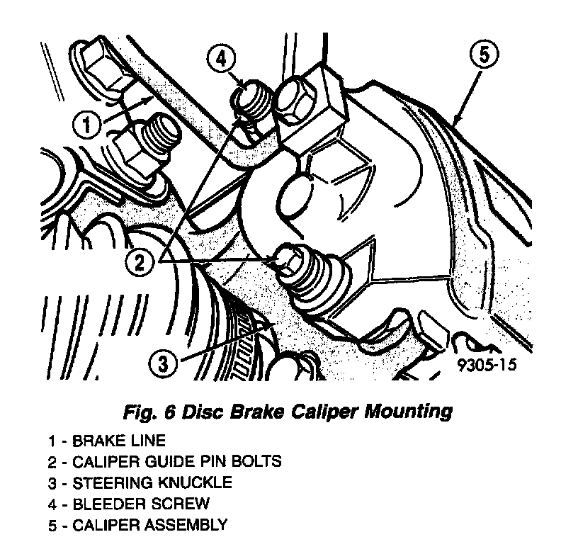 The floating double pin single piston calipers used on this vehicle are mounted directly to the steering knuckles and use no adapter. The caliper is mounted to the steering knuckle using bushings, sleeves and two thru-bolts which thread directly into the steering knuckle.