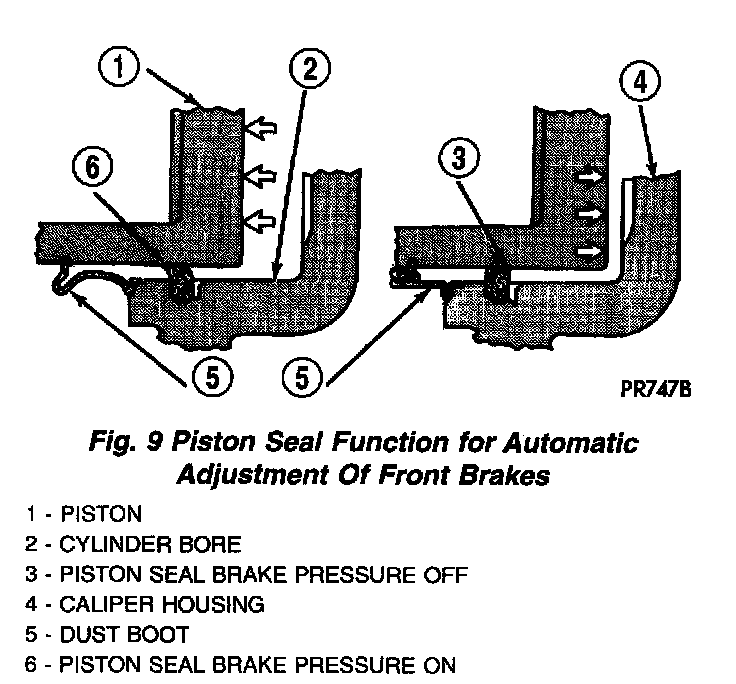 A square-cut rubber piston seal is located in a machined groove in the cylinder bore. This provides a hydraulic seal between the piston and the cylinder wall. The piston seal is designed to pull the piston back into the bore of the caliper when the brake pedal is released. This, along with the brake shoe retractor clips, maintains the proper brake shoe to rotor clearance.