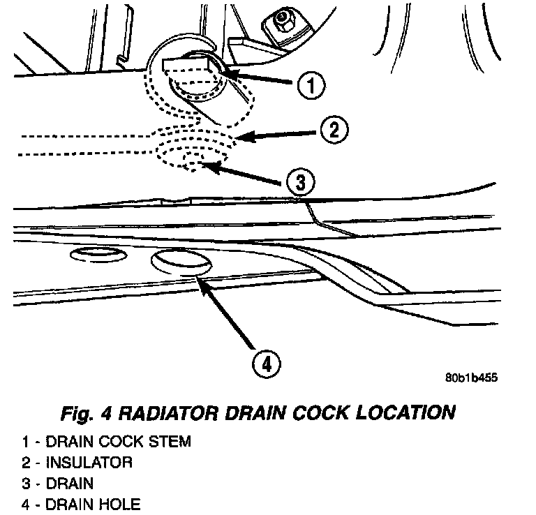 The radiator drain cock that is located at the lower right side of radiator. The drain cock stem is closed in the horizontal position, pointing to 3 o'clock. Draining takes place through the cooling module's lower right side insulator. Do Not Use pliers to open draincock.