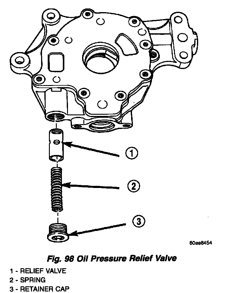 CAUTION: Oil pump pressure relief valve must be installed as shown in (Fig. 98) or engine damage may occur.