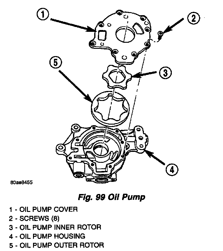 3. Remove oil pump cover screws and lift off cover plate (Fig. 99).