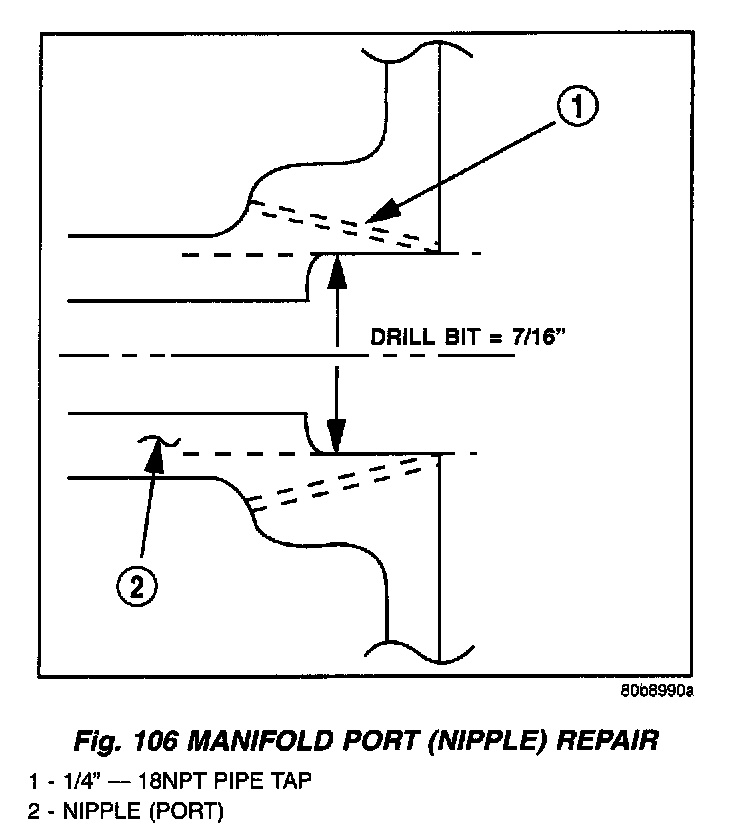 3. Using a 1/4"-18 NPT pipe tap, cut internal threads (Fig. 106). Use caution to start tap in a axis same as original nipple.