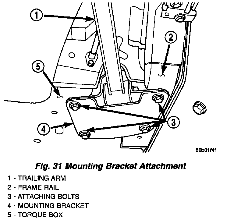 2. Position the trailing arm and forward mounting bracket into the vehicle. Attach to frame rail and torque box with the 4 attaching bolts. Tighten the attaching bolts to 60 Nm (45 ft. lbs.).