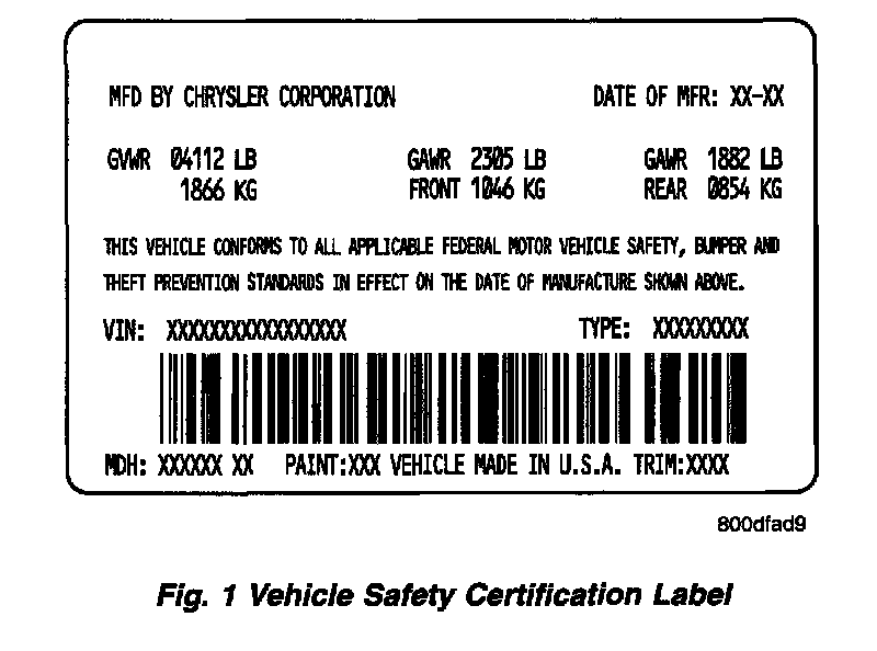 A vehicle safety certification label is attached to the left side of B-pillar or on the rearward facing of the front door (Fig. 1). This label indicates date of manufacture (month and year), Gross Vehicle Weight Rating (GVWR), Gross Axle Weight Rating (GAWR) front, Gross Axle Weight Rating (GAWR) rear and the Vehicle Identification Number (VIN). The Month, Day and Hour of manufacture is also included.