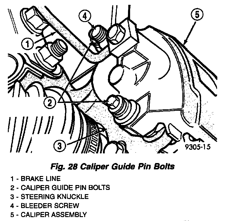 2. Remove the 2 guide pin bolts mounting the caliper assembly to the steering knuckle. Remove the caliper from the front steering knuckle.