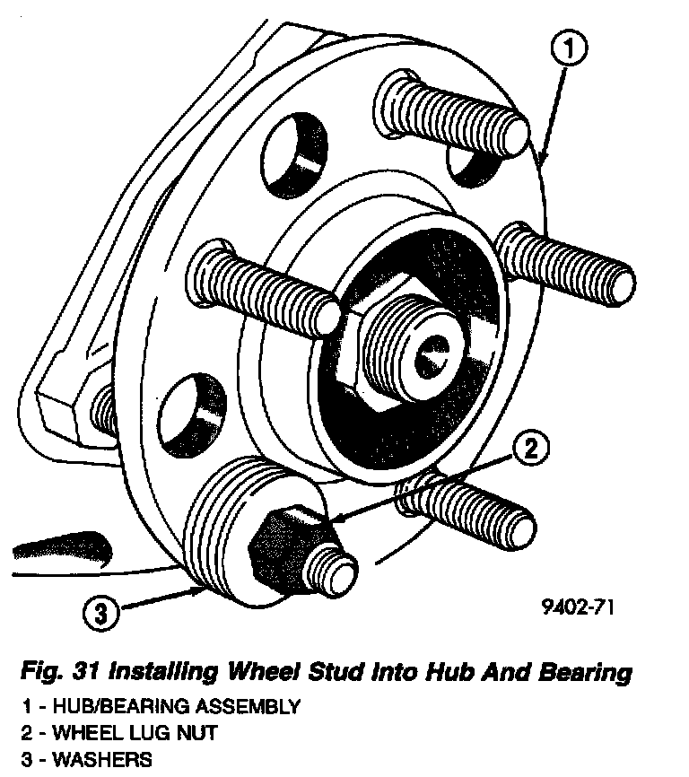 1. Install wheel stud into of hub and bearing assembly from the rear. Install washers on wheel stud, then install a wheel lug nut on stud with flat side of lug nut against washers.