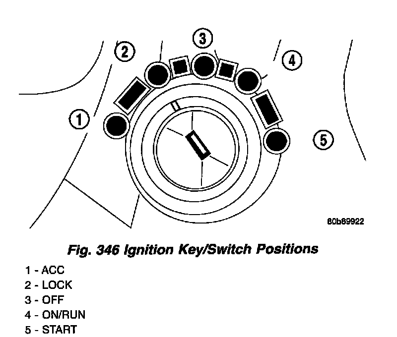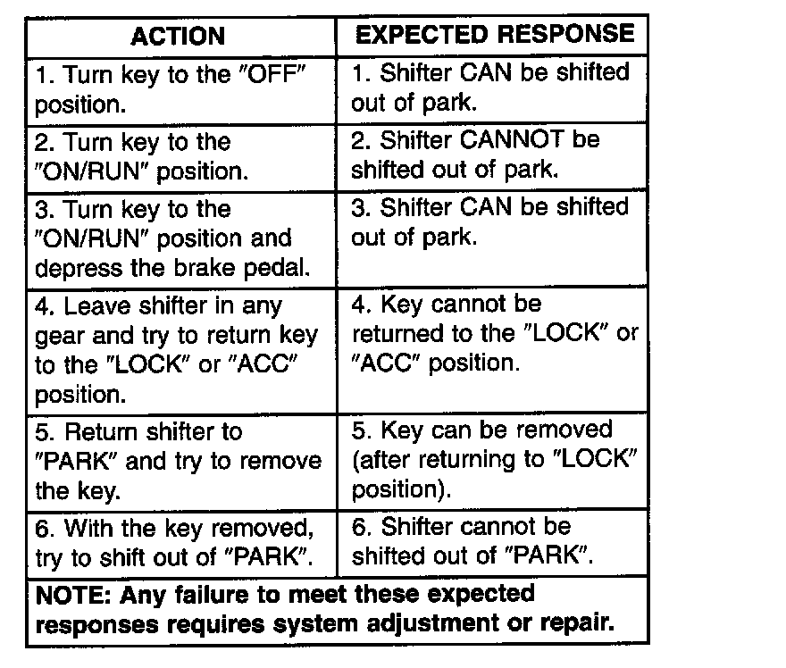 Refer to the chart that expected shifter response, depending on ignition key/switch (Fig. 346) and brake pedal positions.