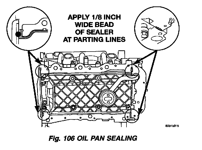 1. Apply a 1/8 inch bead of Mopar Engine RTV GEN II at the parting line of the oil pump housing and the rear seal retainer (Fig. 106).
