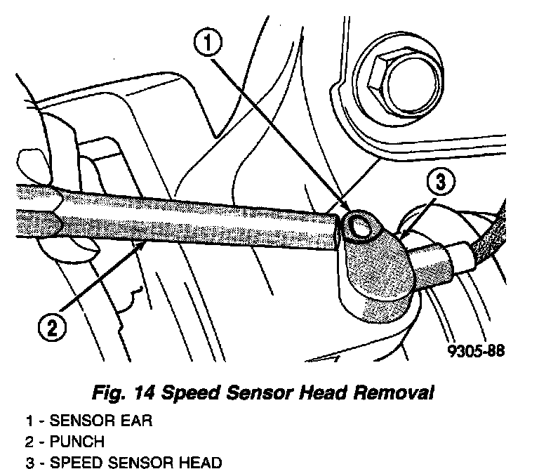6. Carefully, remove sensor head from steering knuckle. If the sensor has seized, due to corrosion, DO NOT USE PLIERS ON SENSOR HEAD. Use a hammer and punch to tap edge of sensor ear, rocking sensor side to side until free.