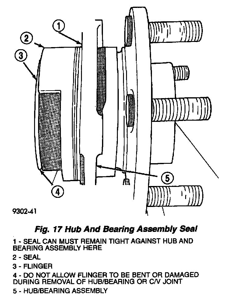 CAUTION: If metal seal on hub and bearing assembly is seized to steering knuckle and becomes dislodged on hub and bearing assembly during bearing removal the hub and bearing assembly MUST not be reused and MUST be replaced with a new hub and bearing assembly. Also if flinger disc becomes damaged (bent or dented) during removal, hub and bearing assembly must be replaced with a new hub and bearing assembly.