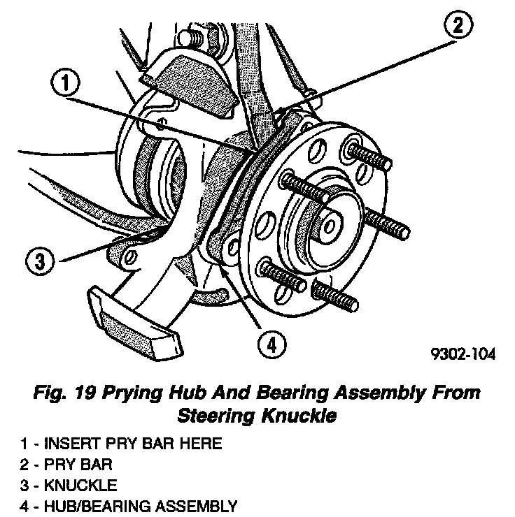 9. Remove hub and bearing assembly from steering knuckle. It is removed by sliding it straight out of steering knuckle and off end of stub axle. If hub and bearing assembly will not slide out of knuckle, insert a pry bar between hub and bearing assembly and steering knuckleand gently pry hub and bearing from knuckle. If stub shaft is frozen to hub and bearing assembly tap end of stub shaft with soft face hammer to free it from hub and bearing spline.