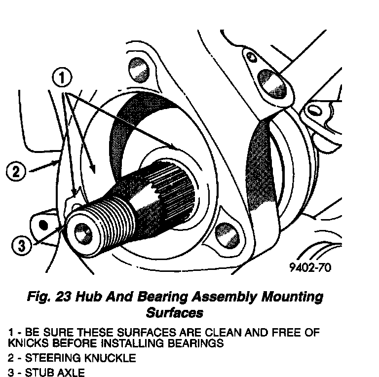 CAUTION: Hub and bearing assembly mounting surfaces on steering knuckle and halfshaft must be smooth and completely free of foreign material or nicks.