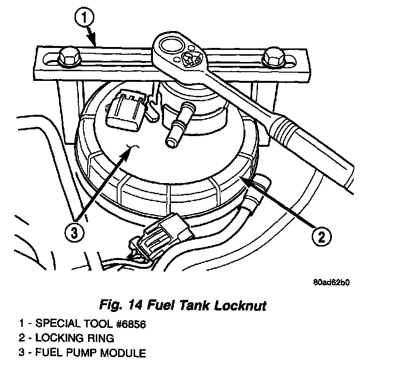 6. Use Special Tool # 6856 to remove fuel pump module locknut (Fig. 14).