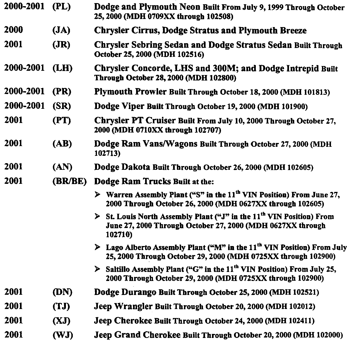 Each dealer to whom involved vehicles were invoiced (or the current dealer at the same street address) will receive a list of their involved vehicles. The vehicle list is arranged in Vehicle Identification Number (VIN) sequence. Owners known to DaimlerChrysler are also listed. The lists are for dealer reference in arranging for service of involved vehicles still in dealer inventory.
