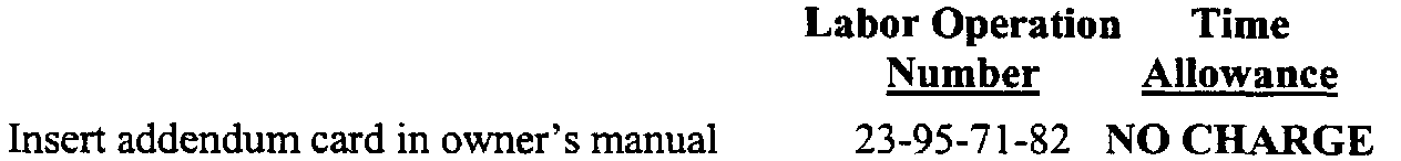 Owner's manual addendum cards are being mailed directly to all owners known to DaimlerChrysler with the owner notification letter. The owners are requested to insert the card into their owner's manual. Dealers must insert a copy of the correct addendum card into each affected unsold vehicle in dealer inventory before retail delivery.