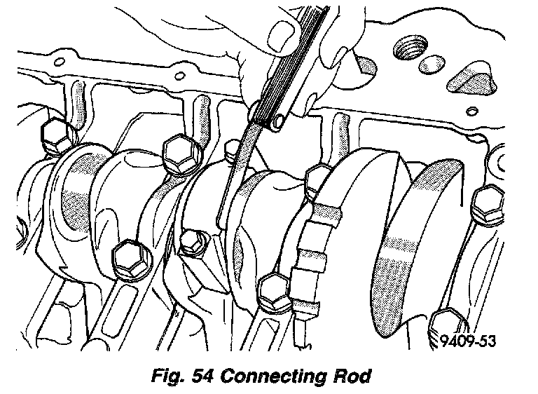 5. Using a feeler gauge, check connecting rod side clearance (Fig. 54). Refer to Specifications for connecting rod specifications.