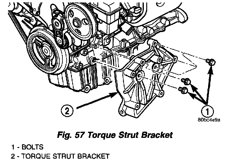 11. Remove lower torque strut/air conditioning compressor mounting bracket from engine (Fig. 57).