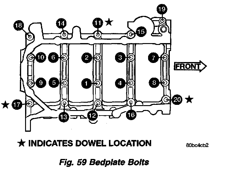 19. Remove all main bearing cap and bedplate bolts from the engine block (Fig. 59).