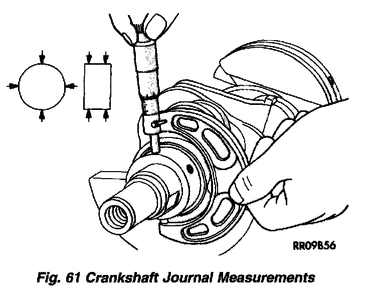The crankshaft journals should be checked for excessive wear, taper and scoring (Fig. 61). Limits of taper or out of round on any crankshaft journals should be held to 0.025 mm (0.001 inch). Journal grinding should not exceed 0.305 mm (0.012 inch) under the standard journal diameter. DO NOT grind thrust faces of No. 3 main bearing. DO NOT nick crank pin or bearing fillets. After grinding, remove rough edges from crankshaft oil holes and clean out all passages.