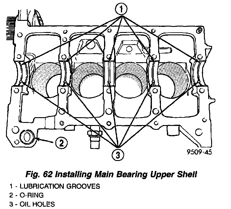 1. Install the main bearing shells with the lubrication groove in the cylinder block. Install O-ring into recess in the block (Fig. 62).