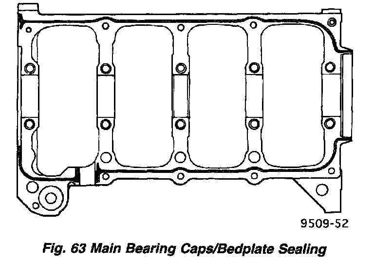 4. Apply 1.5 - 2.0 mm (0.059 - 0.078 inch) bead of Mopar Bed Plate Sealant to cylinder block as shown in (Fig. 63).
