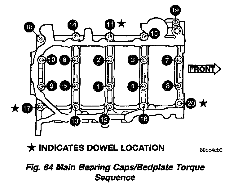 9. Install main bearing bedplate to engine block bolts (11-20), with baffle studs in positions 12, 13 and 16 and torque each bolt to 34 Nm (25 ft. lbs.) in sequence shown in (Fig. 64).