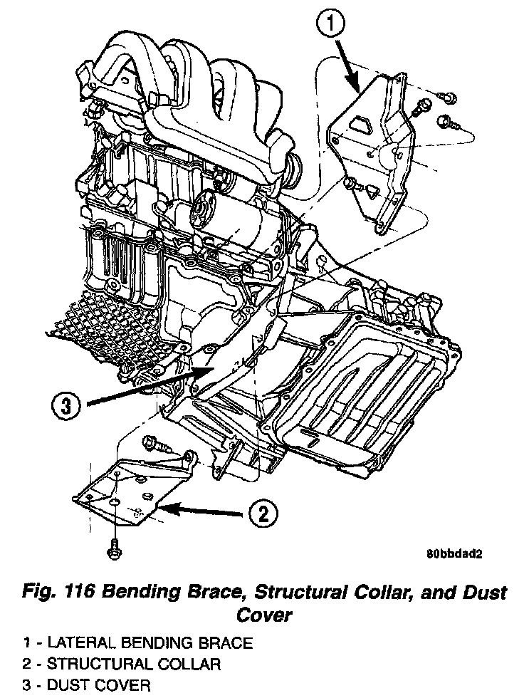 6. Remove lateral bending brace attaching bolts (Fig. 116).