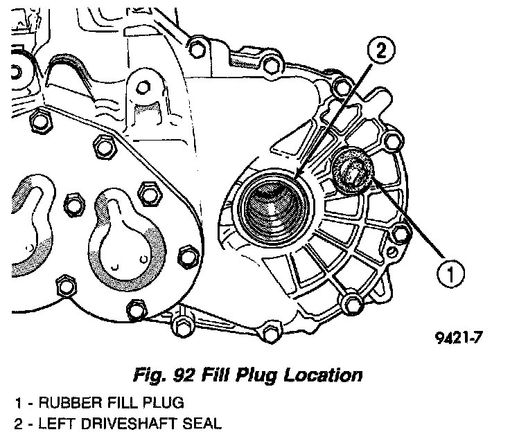 FLUID DRAIN AND FILLAll NV T350 (A-578) transaxles are equipped with a fill plug. The fill plug is located on the left side of the transaxle, differential area (Fig. 92). The fluid level should be within 3/16 inch from the bottom of the transaxle fill hole (vehicle must be level when checking).