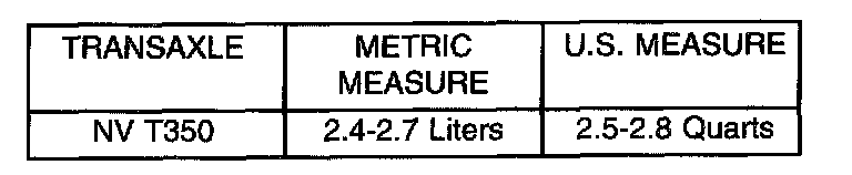 Fill transaxle to capacity. Refer to following chart. Wipe the outside of the transaxle if any lubricant spills.