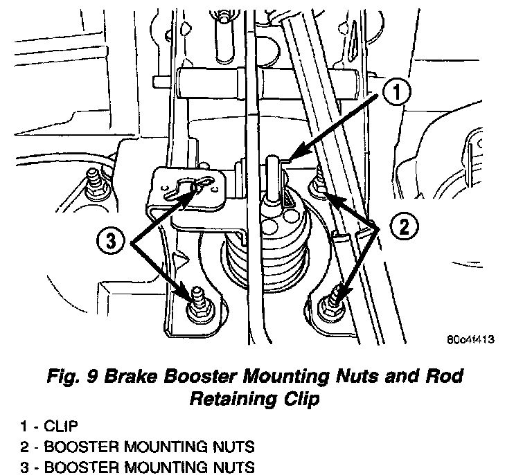 5. Connect brake booster rod to brake pedal. Install retainer clip (Fig. 9).