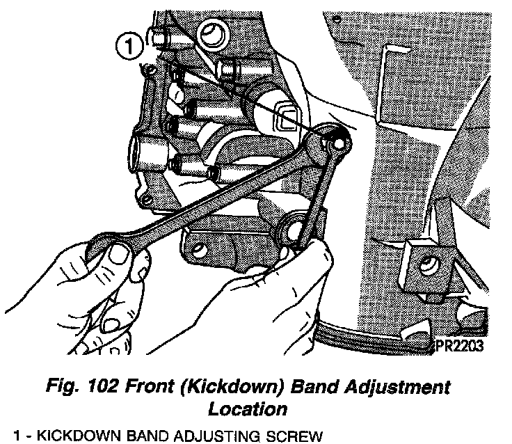ADJUSTMENT - FRONT BANDThe front (kickdown) band adjusting screw is located on the left side of the transmission case above the manual valve and throttle valve levers.