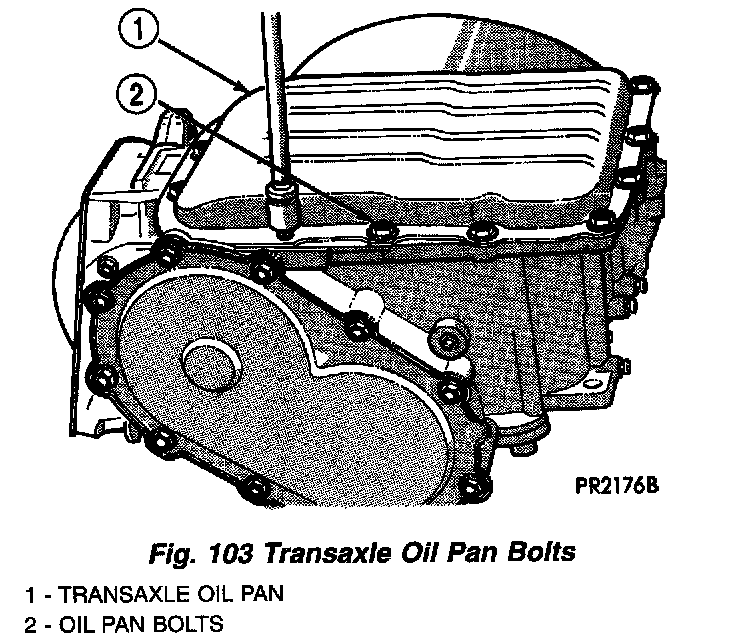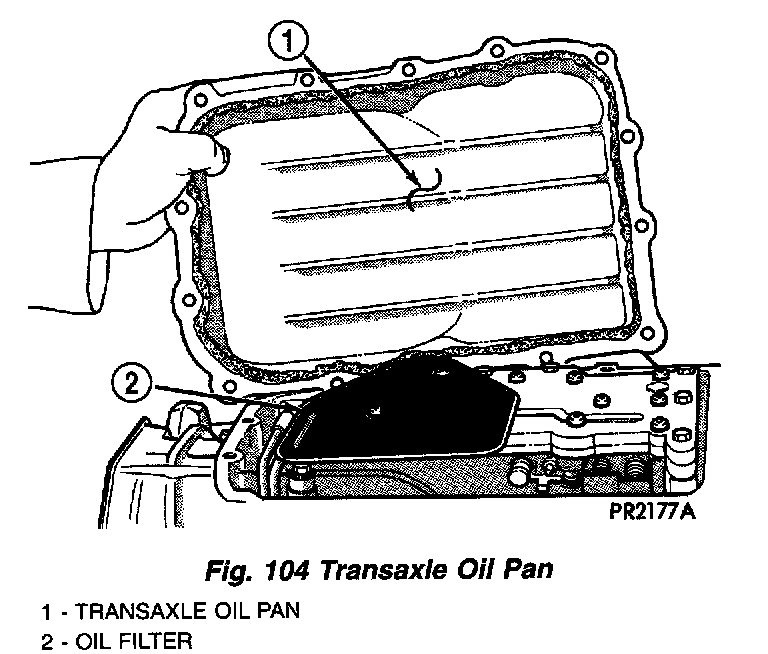 2. Remove transaxle oil pan and drain fluid (Fig. 103) (Fig. 104).