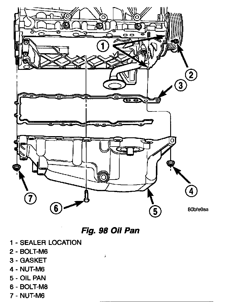 4. Install oil pan and fasteners (Fig. 98) using the following tightening sequence: